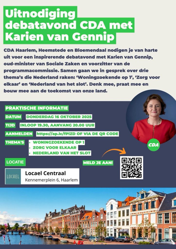 De avond vindt plaats op donderdag 16 oktober in Café Locael bij station Haarlem. De inloop is vanaf 19.30 uur, het debat start om 20.00 uur en eindigt rond 22.00 uur. Daarna is er gelegenheid om na te praten. Aanmelden graag per email via bestuur@hhb.cda.nl.